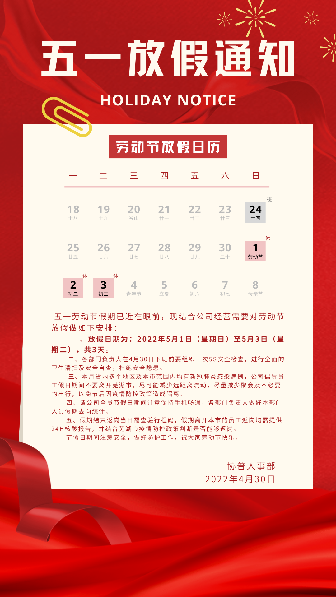 同時(shí),也希望大家在享受“五一”假期的同時(shí),做好個(gè)人防護(hù),注意自身安全,過(guò)一個(gè)平安的勞動(dòng)節(jié)!