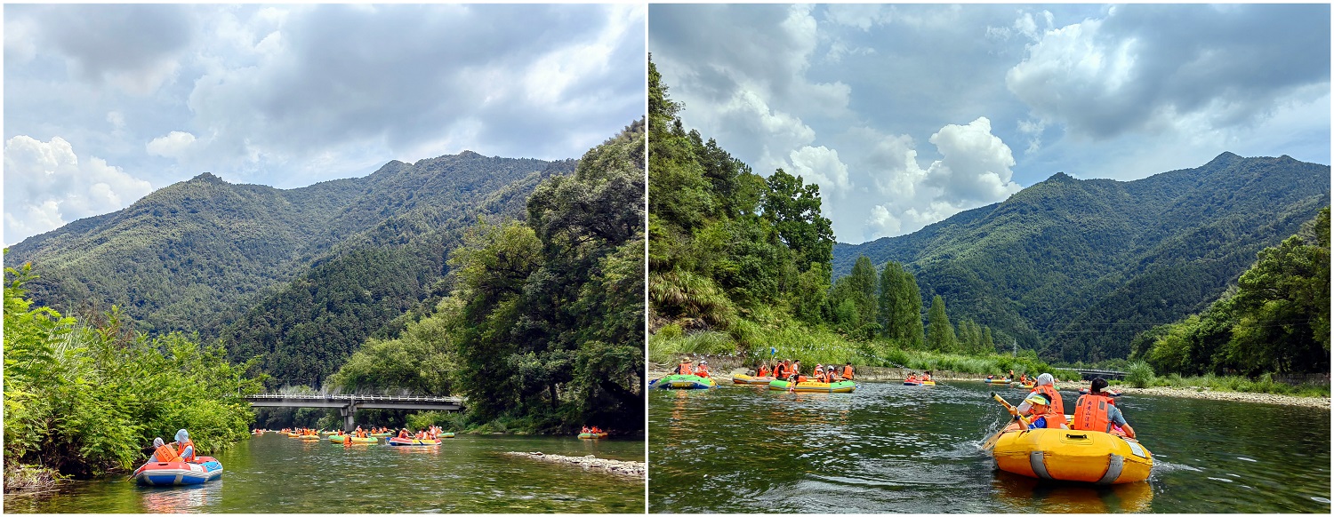 此次行程兩天一夜,在導(dǎo)游的帶領(lǐng)之下,我們首先來到石臺(tái)縣大演鄉(xiāng)剡溪村的西黃山漂流景區(qū)。下榻之時(shí),正值正午時(shí)分,景點(diǎn)兩岸青山疊嶂、風(fēng)光旖旎、草木蔥蘢、景色怡人。協(xié)普家人們換好服裝,穿上救生衣,在工作人員的協(xié)助之下,或一家?guī)卓凇⒒蛉搴糜呀Y(jié)伴乘筏而行、泛舟漂流,水面波光瀲滟、河底各式各樣的鵝卵石靜靜地躺著,日復(fù)一日被溪水沖刷,變得光滑又圓潤(rùn),坐在游筏里俯身去看,“瞧,有不少小魚正悠閑地在它的身上游過呢”,其水之清澈由此可見一斑。此次漂流全程3公里,在漂流過程中,除了欣賞到秀美的湖光山色,體驗(yàn)到劈波斬浪的沖刺暢快感,更讓人愜意的是,在河灘淺水區(qū)域漂流回緩,協(xié)普家人們正帶著孩子們,在這悠閑的時(shí)光里愉快的打起了水仗,孩子們帶上了自己心愛的水槍玩起了水槍大戰(zhàn),有人帶來了水盆和水瓢,于是乎水槍大戰(zhàn)現(xiàn)場(chǎng)演變成了潑水節(jié),歡笑聲、尖叫聲蕩漾在山谷之間,在這愜意的時(shí)光里,平日的壓力和煩擾仿佛已煙消云散。