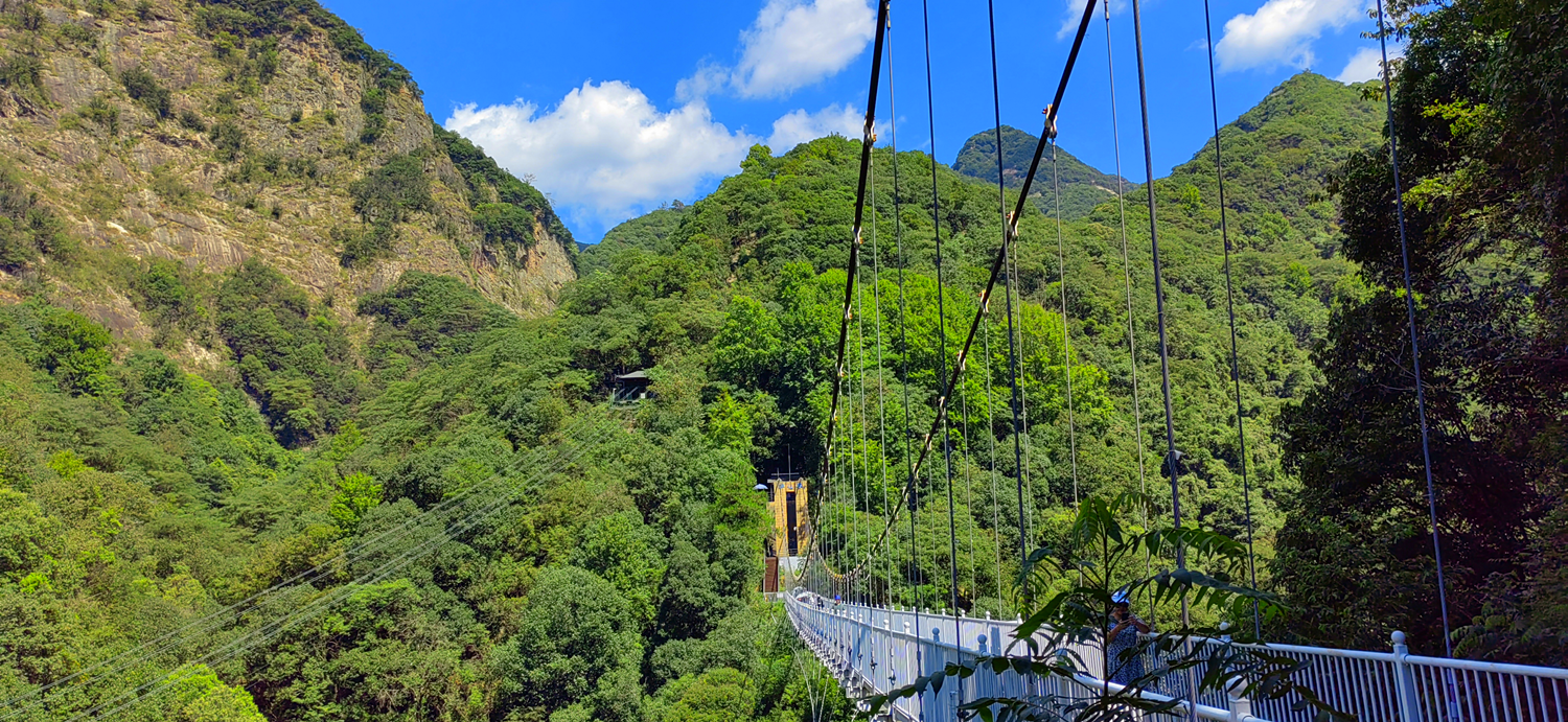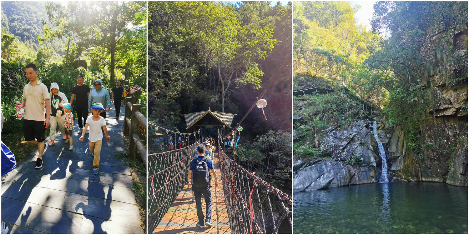 晚上體驗(yàn)了農(nóng)家樂菜肴和當(dāng)?shù)靥厣袼藓?,第二天早早的起床,吃完早餐集合,大家興致勃勃地乘著大巴來到了醉山野景區(qū),這里是安徽省內(nèi)第一個(gè)5D玻璃橋皖南地區(qū)最大的瀑布群。在進(jìn)入景區(qū)之前,有一段鄉(xiāng)村道路,徒步的過程頂著早上八九點(diǎn)的太陽(yáng)就覺得酷暑難耐,然而當(dāng)我們正式踏入景點(diǎn),走在山谷間的步棧道上,遠(yuǎn)處是蔥郁的山林、近處是流動(dòng)的溪水、頂上是一片陰涼,只聽見大朋友們小朋友們都在說“好涼快啊,好涼快??!”沿著步棧道繼續(xù)前行,來到了千花橋,這里是著名的網(wǎng)紅打卡點(diǎn),小朋友們都絡(luò)繹不絕的脫下鞋子、挽起褲腳,下水嬉戲游玩。有合影拍照的、有撿起小石片仍水花的、還有在石頭縫里抓螃蟹的。大家坐在陰涼的石頭塊上休憩閑聊,甚至玩笑起來,富硒山水、天然氧吧,以后老了退隱山林一定要來這里休養(yǎng)生息。有人不被沿途風(fēng)景耽誤過久,繼續(xù)往山上攀爬,他們到了山頂穿過了玻璃棧橋,體驗(yàn)了“一覽眾山小”的視野和格局。由于兩個(gè)月沒有下雨,雖有山谷溪流卻看不到震撼的黃崖瀑布群,實(shí)屬遺憾,卻也給大家下次再來此一游留下了機(jī)會(huì)。