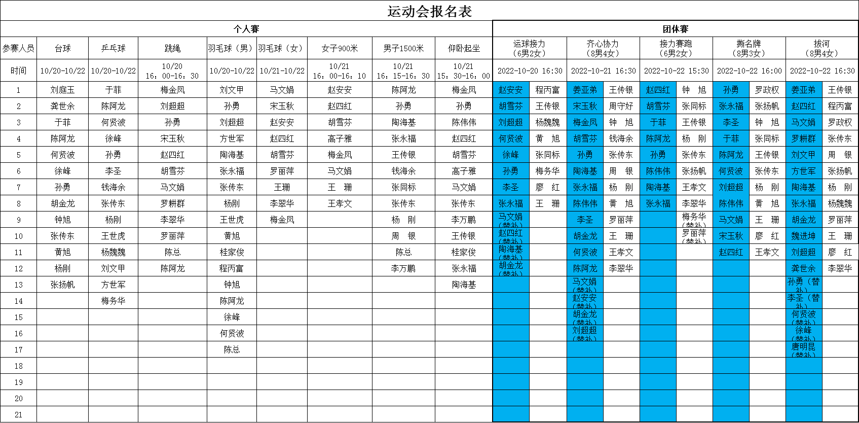 金秋送爽、丹桂飄香,在這秋高氣爽的美好時(shí)節(jié),我們滿懷喜悅的心情迎來了公司2022年度秋季職工運(yùn)動(dòng)會。本屆運(yùn)動(dòng)會分個(gè)人賽、團(tuán)體賽,自10月20日至22日共持續(xù)3個(gè)下午,比賽項(xiàng)目包括乒乓球、羽毛器(男子、女子單項(xiàng))、臺球、跳繩、仰臥起坐、女子900米,男子1500米長跑8項(xiàng)個(gè)人賽,還有齊心協(xié)力、運(yùn)球接力、女子接力賽、男子接力賽、撕名牌、拔河共6項(xiàng)團(tuán)體賽。在歷屆運(yùn)動(dòng)會的賽程、賽項(xiàng)上都增加了新的活動(dòng)亮點(diǎn),從參賽名單上不難看出,全體協(xié)普家人的熱情和參與度都異常高漲。